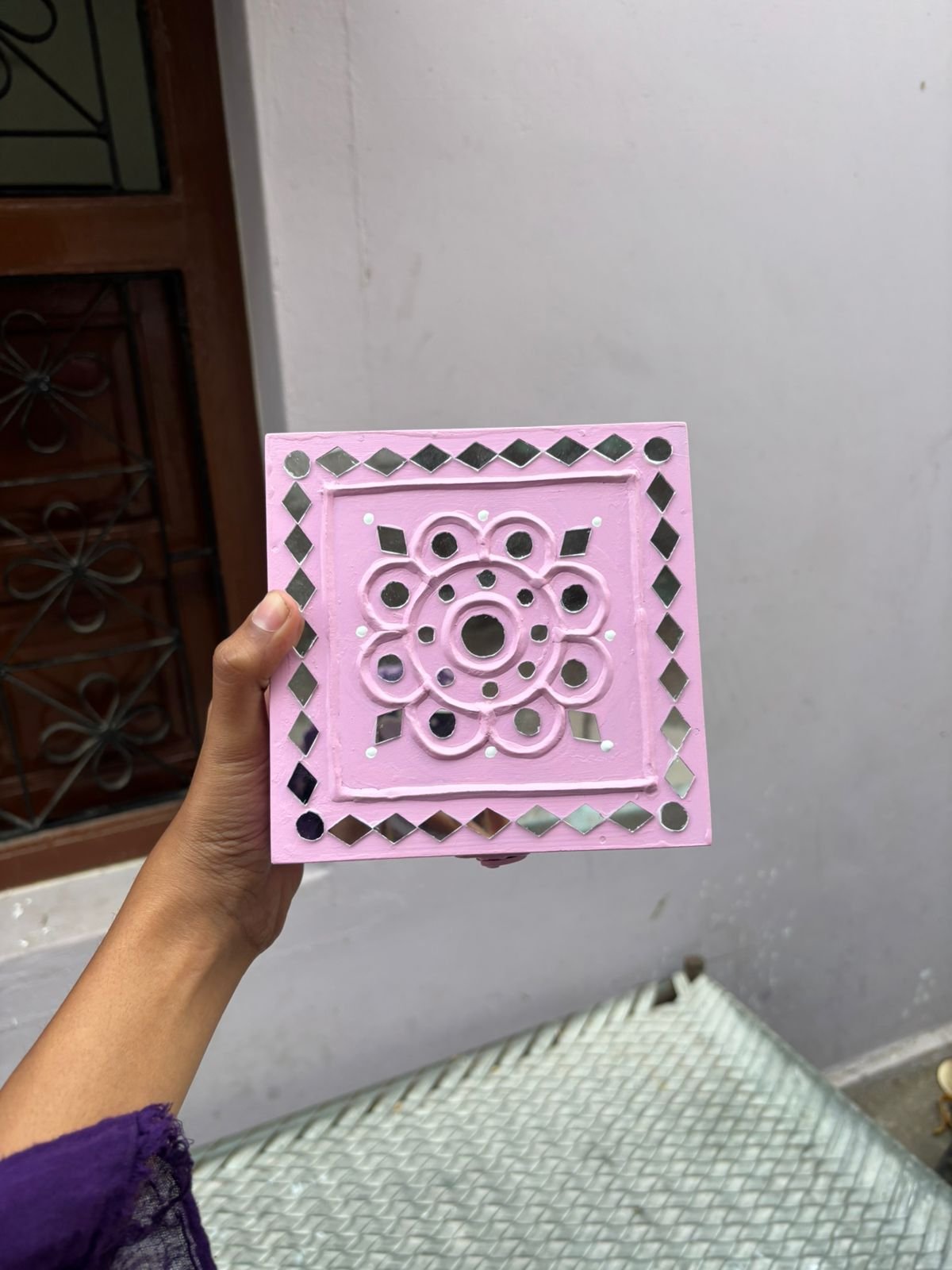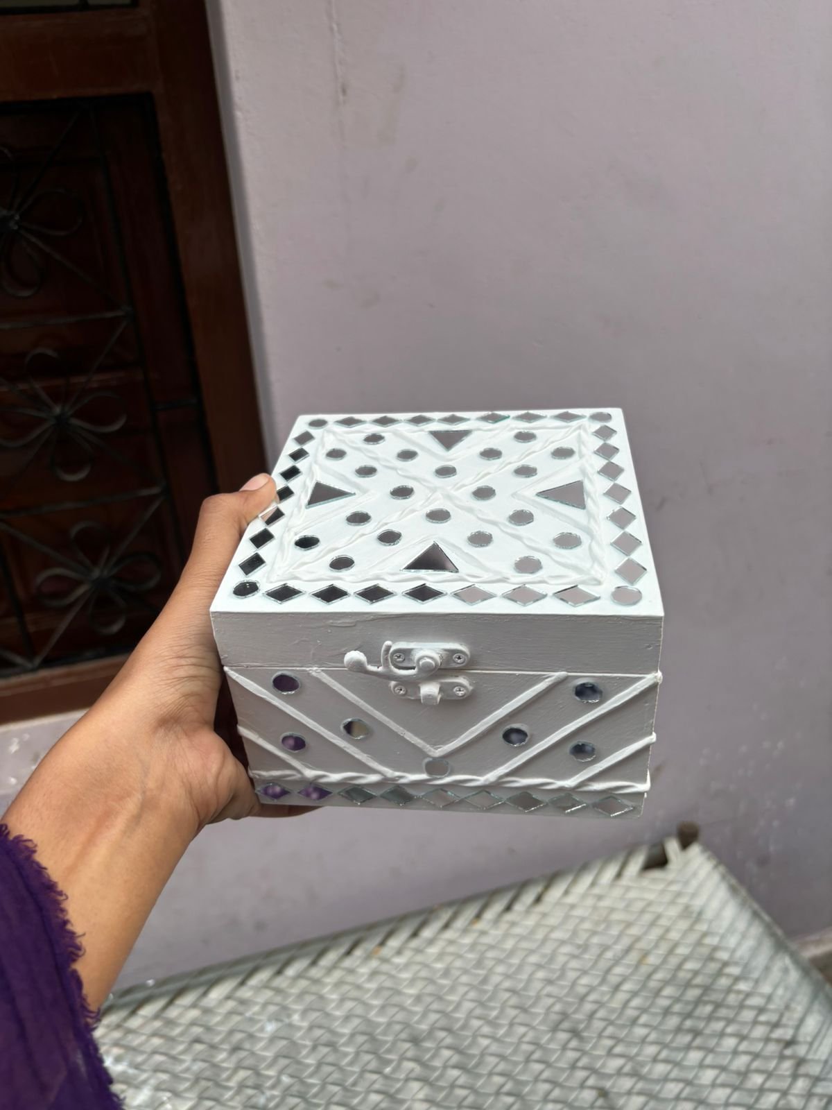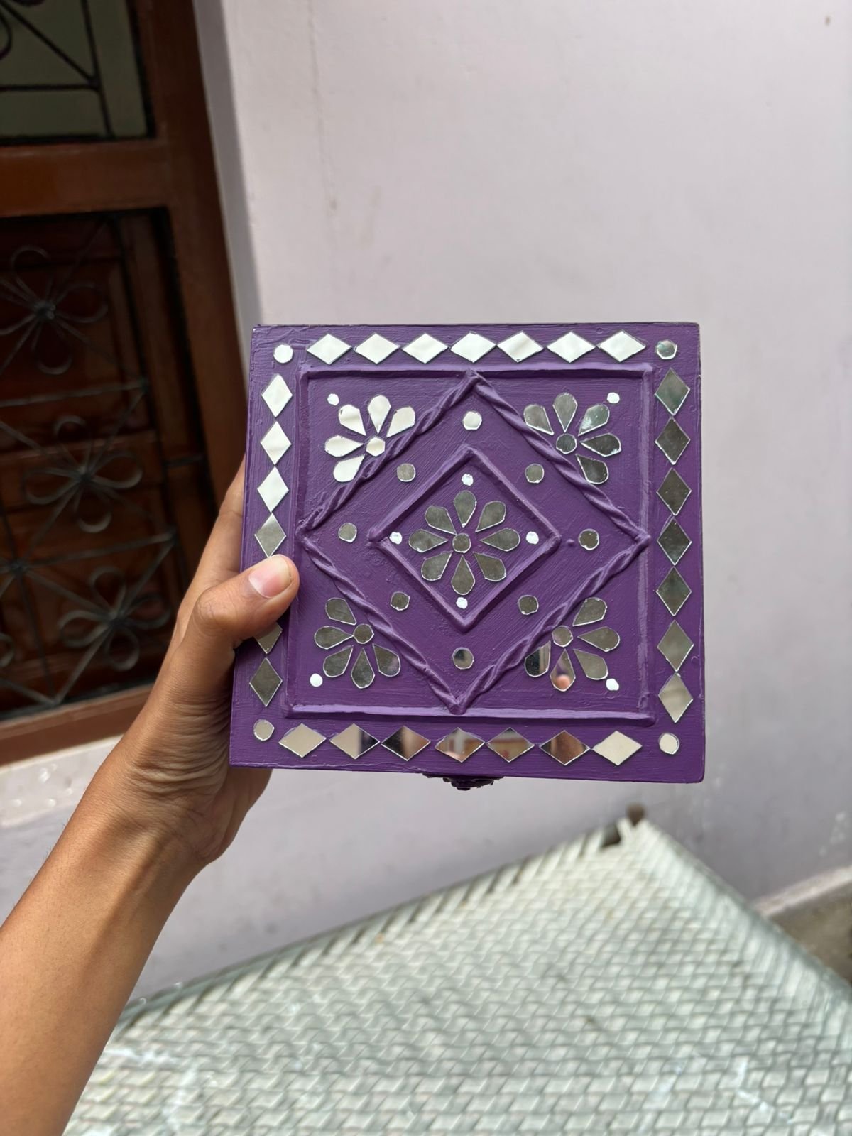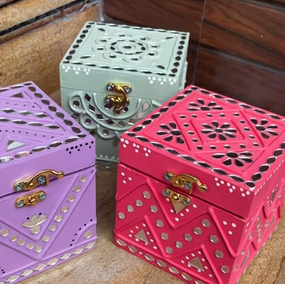 Crafted from a sturdy wooden base and decorated with natural clay mud work and hand-set mirrors, this jewelry box reflects true artisanal excellence. The fine detailing and embedded mirror accents enhance its aesthetic appeal while maintaining structural durability.